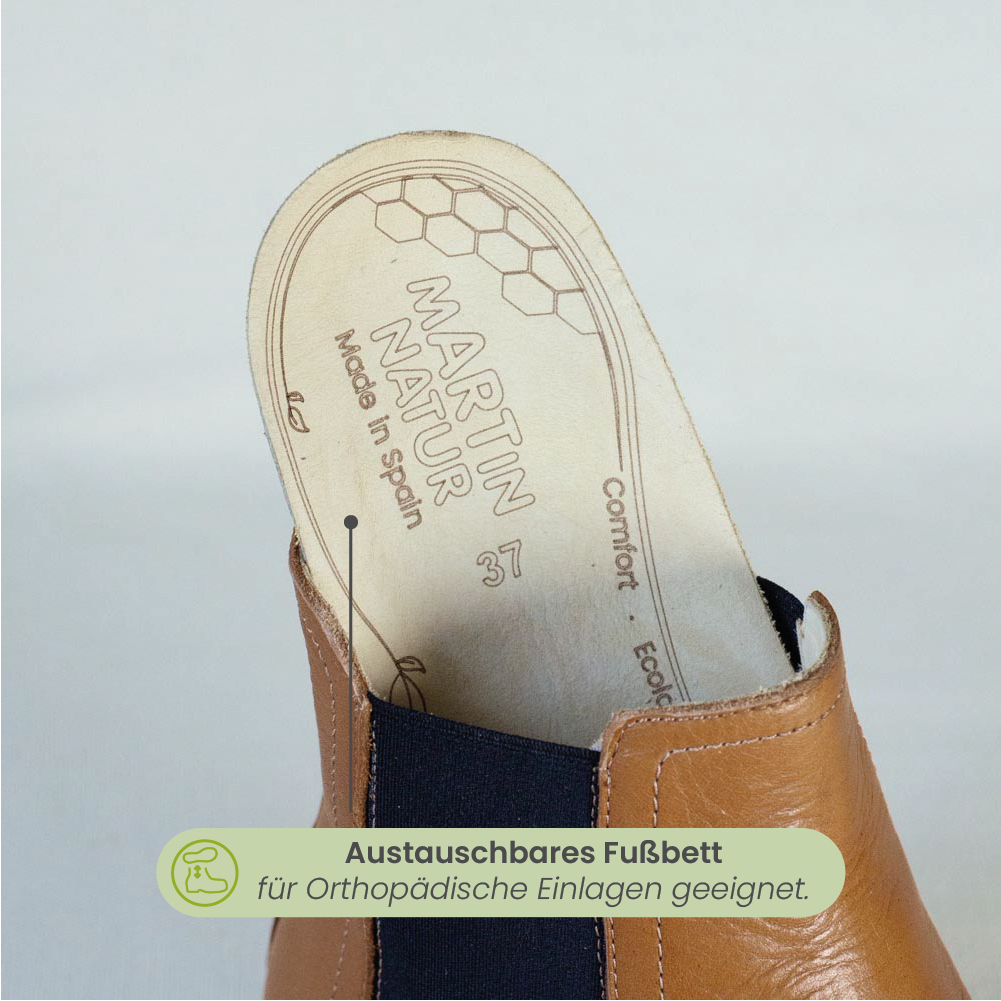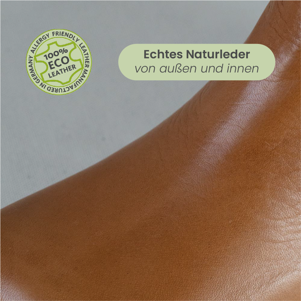 Unsere Schuhe bestehen aus sorgfältig ausgewählten, nachhaltigen Materialien – darunter pflanzlich gegerbtes Leder, Bio-Baumwolle und Naturkautschuk. Mehr über die Besonderheiten unseres Leders erfahren Sie hier.